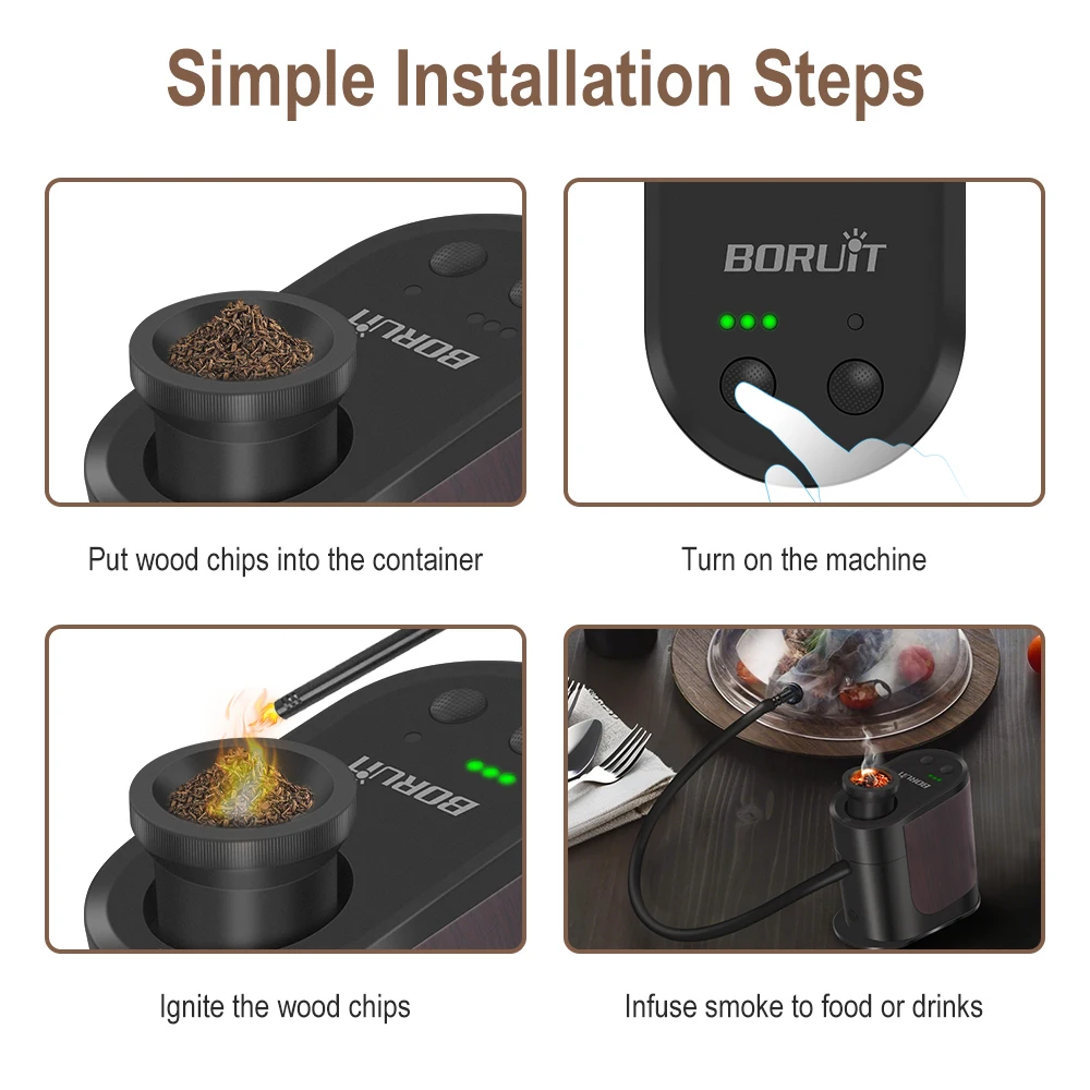 Portable and Durable Smoking Gun Measuring 12*12*26.4CM and packaged in a compact 186*161*77MM box, the BQ500 Smoker Machine is easy to carry and store. Its waterproof design ensures durability, making it a must-have for molecular gastronomy enthusiasts. Quickly infuse your food and drinks with smoky flavors using various wood chips, teas, herbs, spices, hay, and dried flowers.