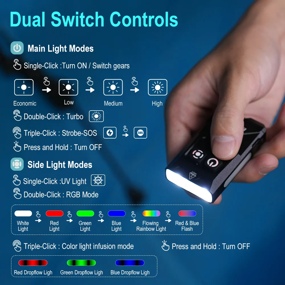 Multiple Lighting Modes – Features adjustable brightness levels, strobe, SOS, UV mode, and RGB color cycling with memory function, making it ideal for various scenarios.