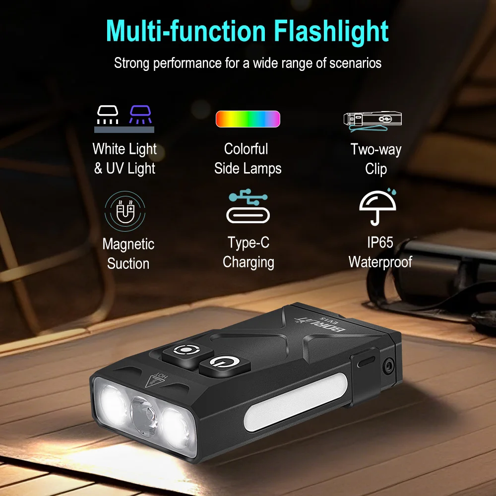 Triple Light Sources – Equipped with dual 351B white LEDs (6500-7000K), a 365nm UV light, and 9 RGB side lights, offering versatile lighting options for daily use, inspections, and emergency situations.