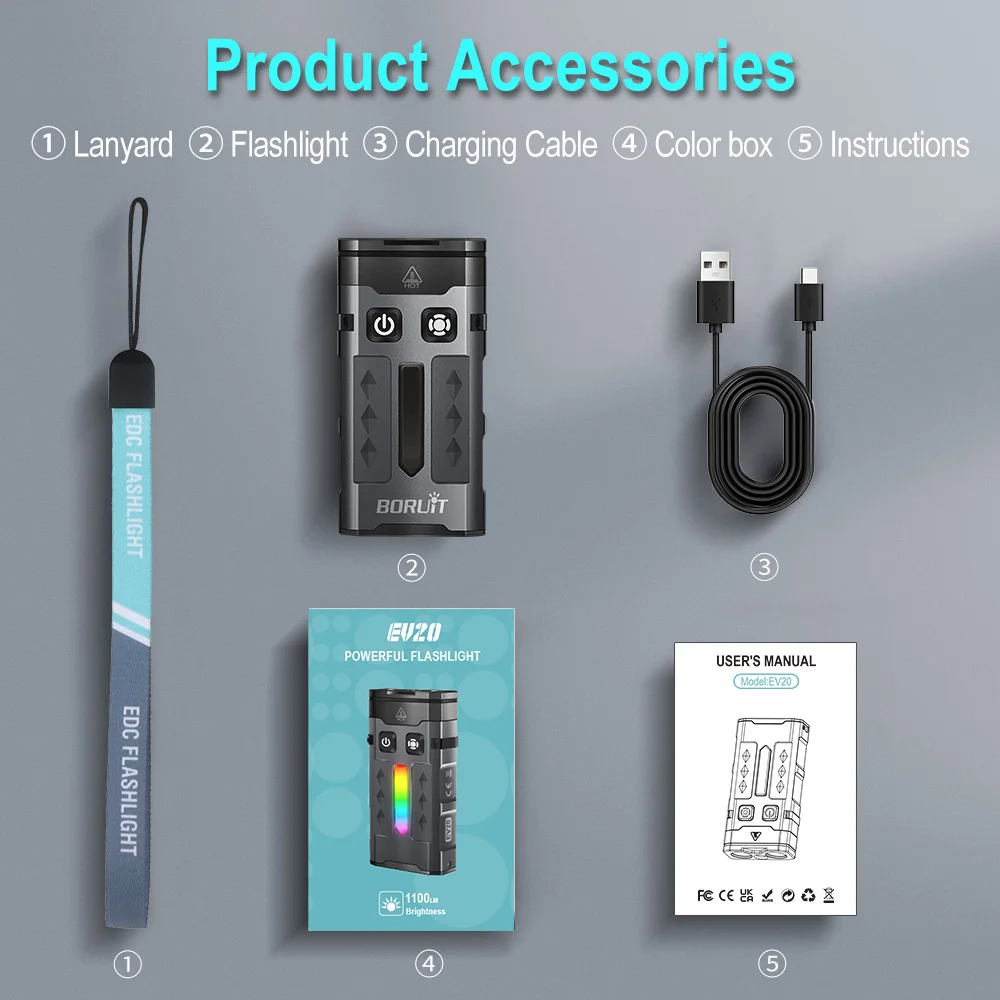 Comprehensive Kit Included – Comes with flashlight, pocket clip, keyring, 0.5m black charging cable, lanyard, color box, and user manual – everything you need in one complete package.