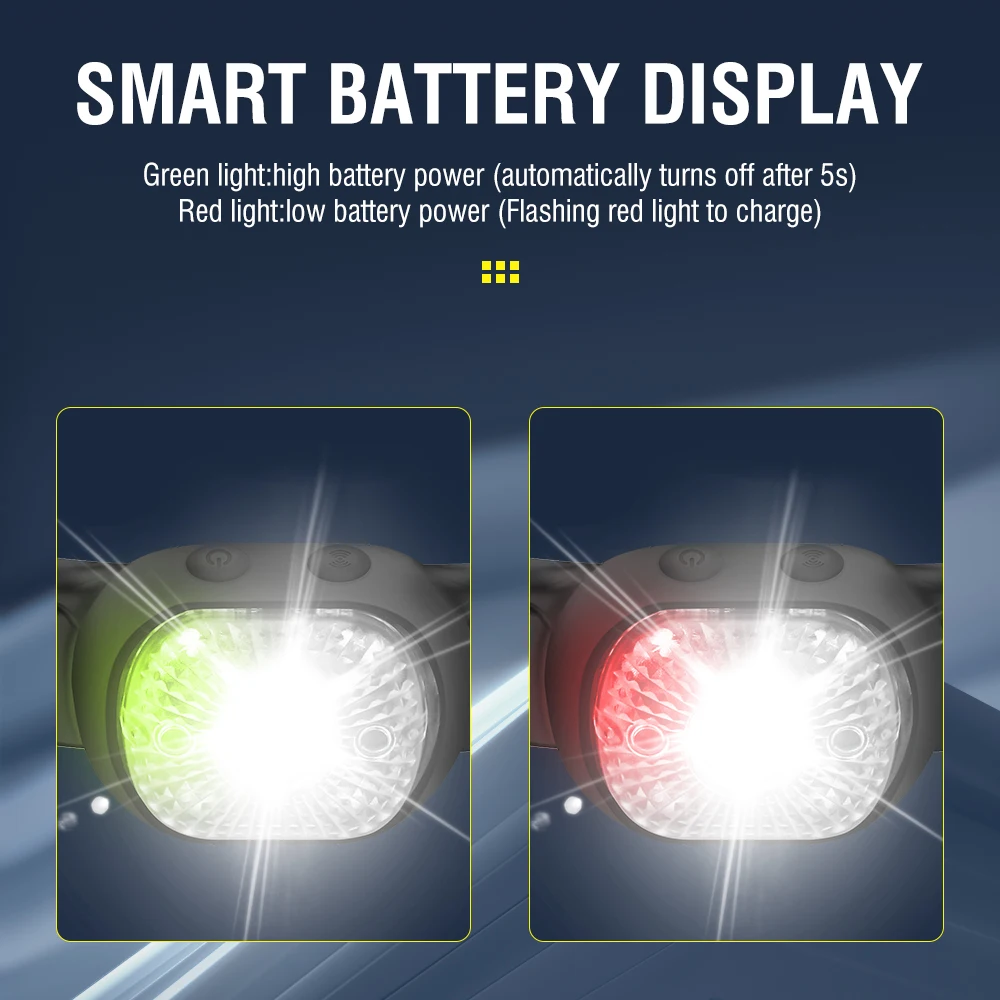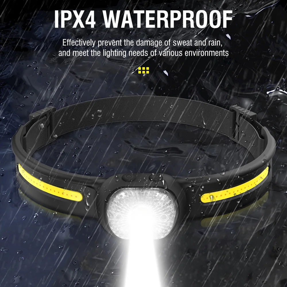 FREE YOUR HANDS - Click the switch button to enter the induction mode, you can turn on/off the headlight by just waving your hand within the sensor function range. IPX4 waterproof design for camping, hiking, running, climbing and car repairing.