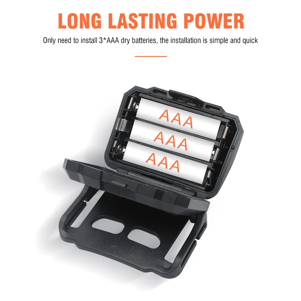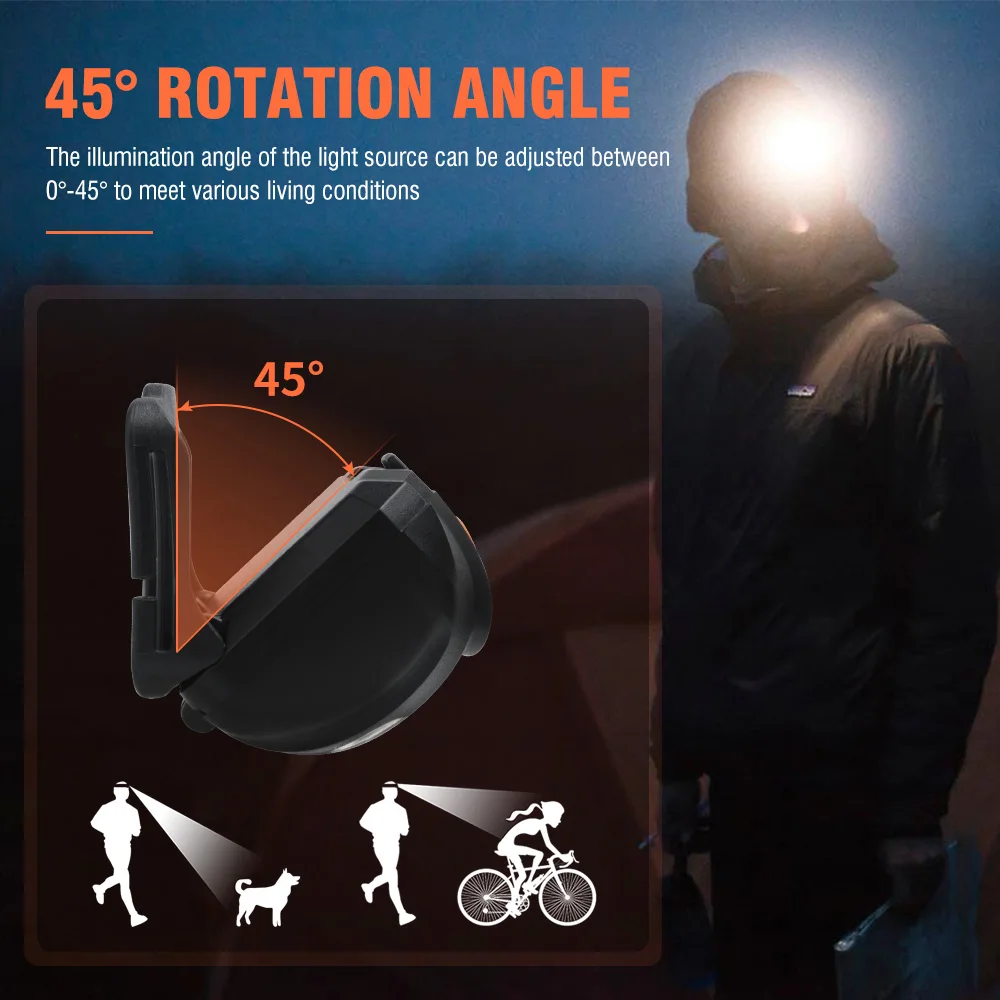 IPX4 Waterproof and 45° Adjustable LED Headlamp ➤➤ IPX4 Water Resistant ,this headlight can be used under terrible weather ,but don't use it as a diving headlamp .The view angle of the light is adjustable with 45°, so you won’t be tired when you wear with this head lamp.
