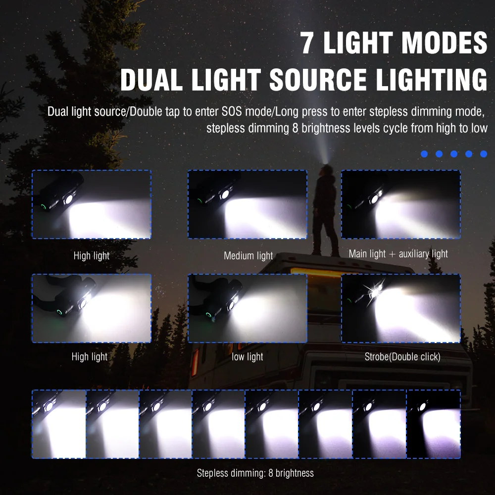 Modes:main light(high)--main light(medium)--full light--side light(high)--side light(Low)--Strobe(double click), Long press to enter the stepless dimming mode, stepless dimming 8 levels brightness from high to low.