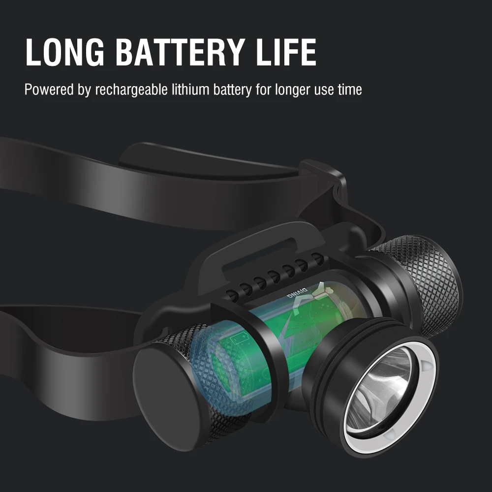 IPX8 high-grade waterproof performance. The head lamp adopts a fully enclosed one-piece structure, and the battery inlet is equipped with two wear-resistant waterproof rings, so the headlight has a very good waterproof effect, the waterproof level reaches IPX8, and can meet the use of underwater 60M Require.