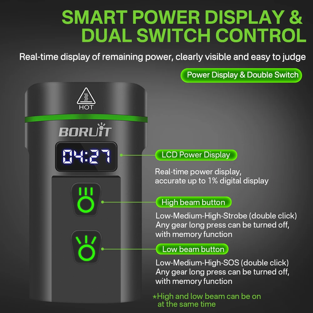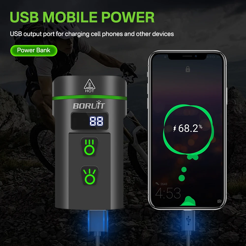 Durable and Reliable: Crafted from high-quality aluminum alloy, this bicycle light is built to withstand the toughest conditions. It boasts an IP67 waterproof rating, ensuring reliable performance in all weather conditions. The light also includes a digital display for discharge time and a USB output for emergency phone charging.