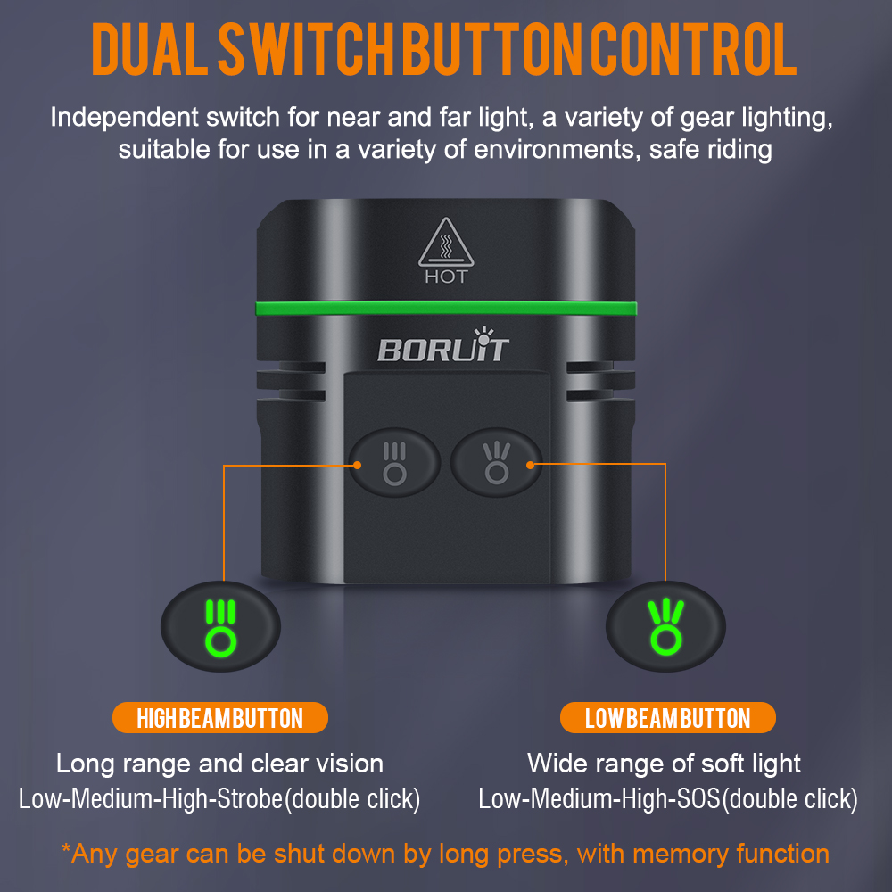 Special functions: high beam low-medium-high, double-click to flash. Low beam low-medium-high, double-click to SOS, long press for 2 seconds in any gear to shut down, with memory function.