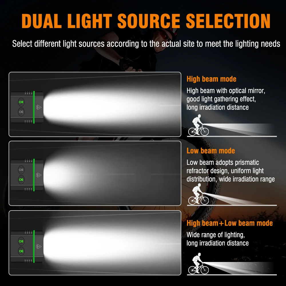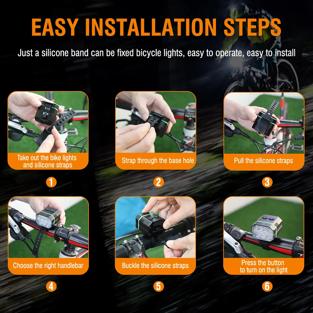 HIGH BRIGHTNESS & MULTI LIGHT MODES - Each bike light is designed with 6 high beams leds and 4 low beams leds, controlled by independent switches. The front light has 3 X 4 modes to meet your needs.