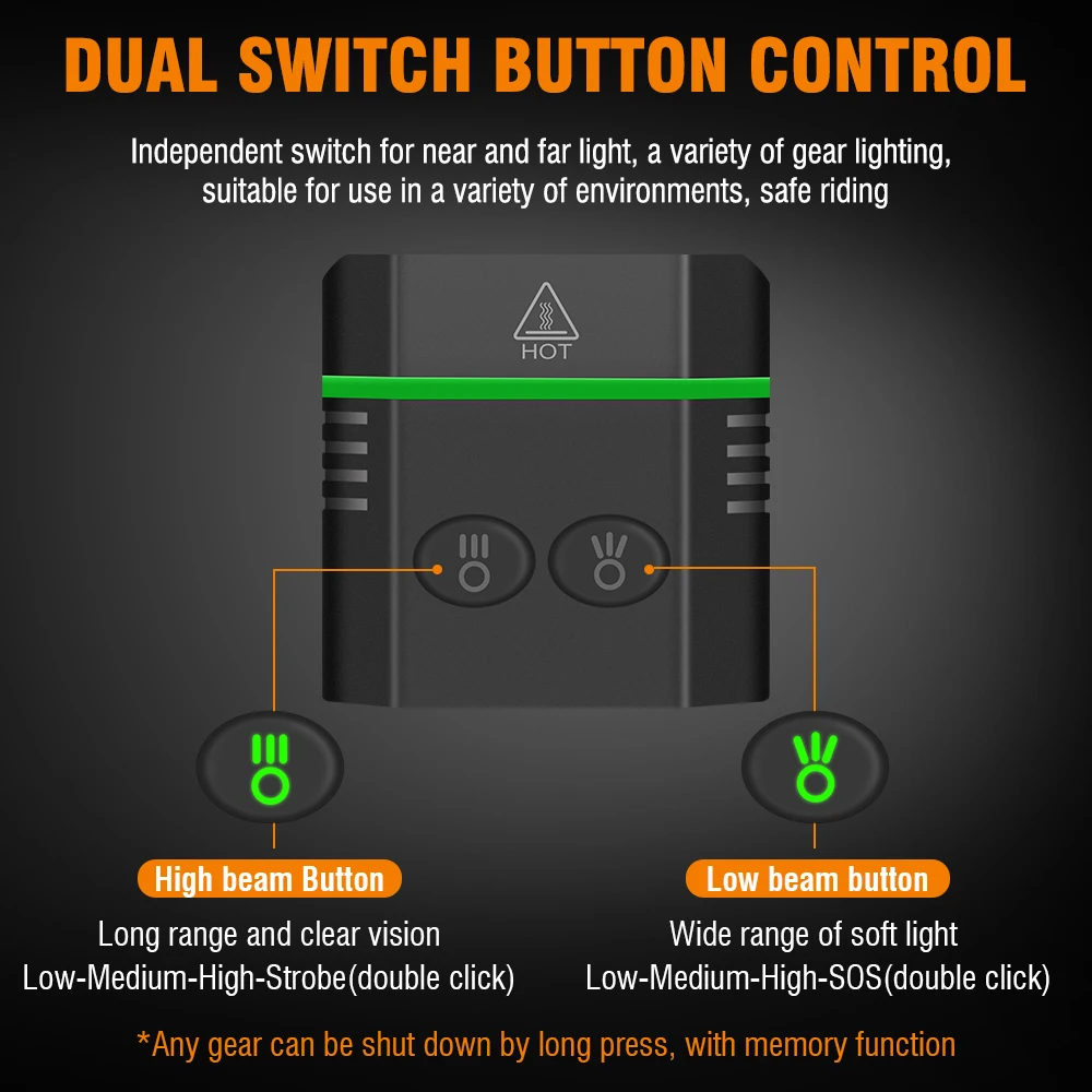 Memory Function: Unlike the others, This bike headlamp added memory function. In any mode, turn on for over 10s, when it is turned on again, the light would stay in the mode you used last time.